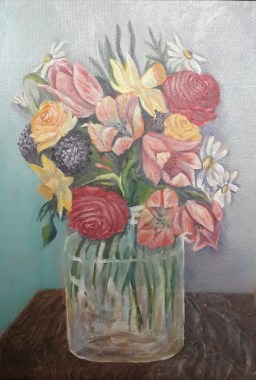 The vase has been placed on a table. The transparent glass vase and the dark wood table provide a contrast in the painting. The background colour has been changed. The colour of the table and the background is visible through the glass vase. All this has resulted in a vibrant painting.