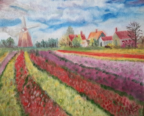The source photograph for this painting was sent to me by a dear aunt. Tulip fields has been painted in impressionistic manner. The colourful tulip beds seem to merge into the horizon. The giant windmill and country cottages provide a backdrop to the tulip fields.