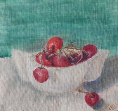#177 Cherries in a Bone China Bowl Published November 3, 2019 at 2458 × 2314 Cherries in a Bone China Bowl Oil on Canvas (7 x7) Still life painting of cherries in a white bowl