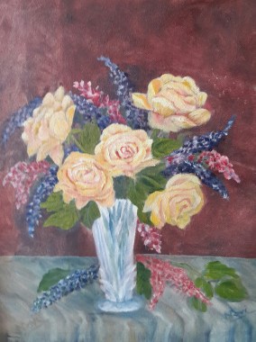 Various yellows such as ochre, chrome, cadmium and lemon have been used with mixes of reds, blues and whites to paint the roses. The supporting flowers compliment the yellow roses. The light shining on the crystal vase shows its edges.