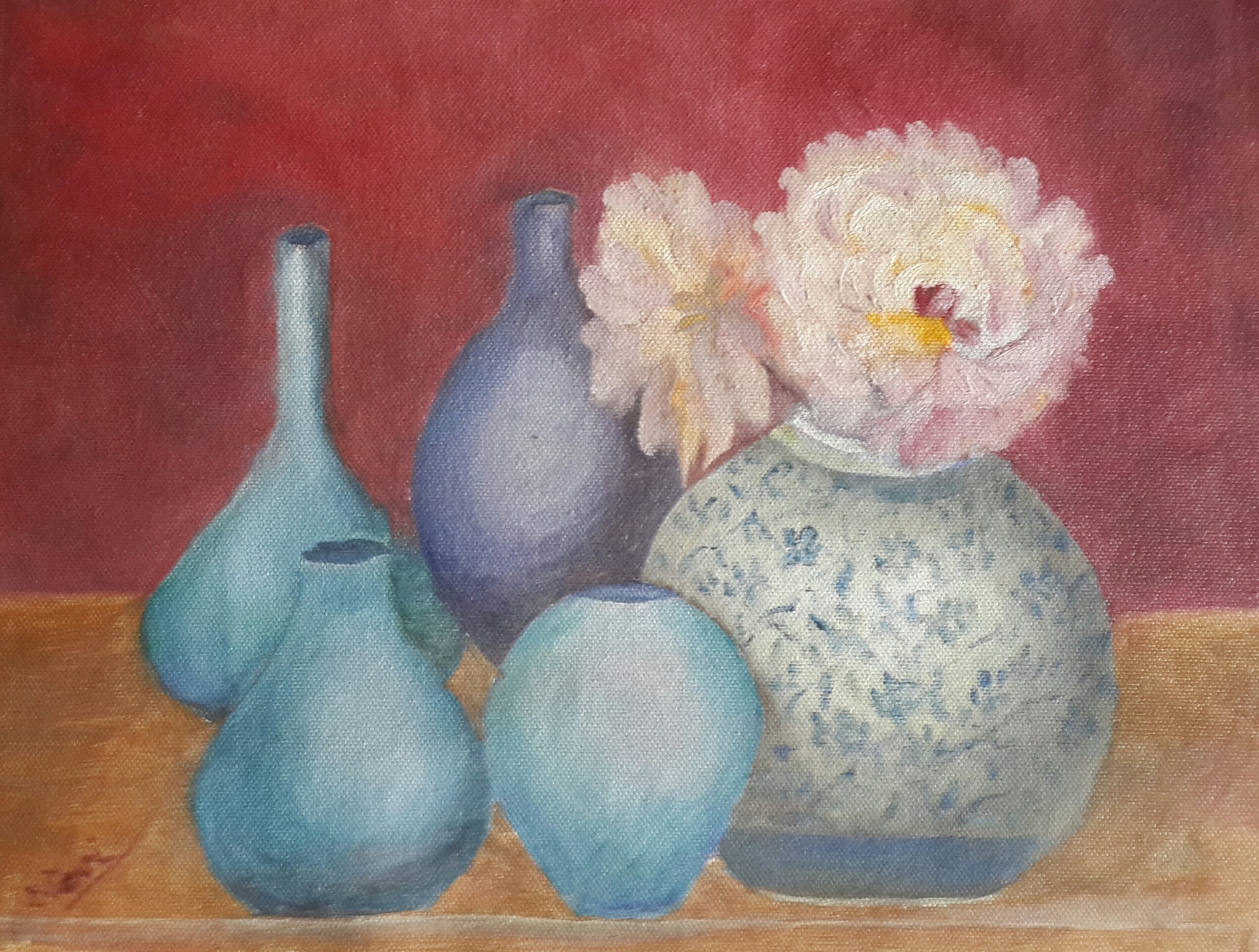 I wanted to mix the blues and experiment with different shapes of the vases. These paintings gave me ample opportunity to do so. Cobalt, ultramarine, Prussian blue were mixed with viridian hue, lemon yellow and titanium white for various vases. It was fun to paint the highlights on the vases. Once the vases were painted, I felt like painting some flowers in them. So added the peonies in one of the vases in each painting.